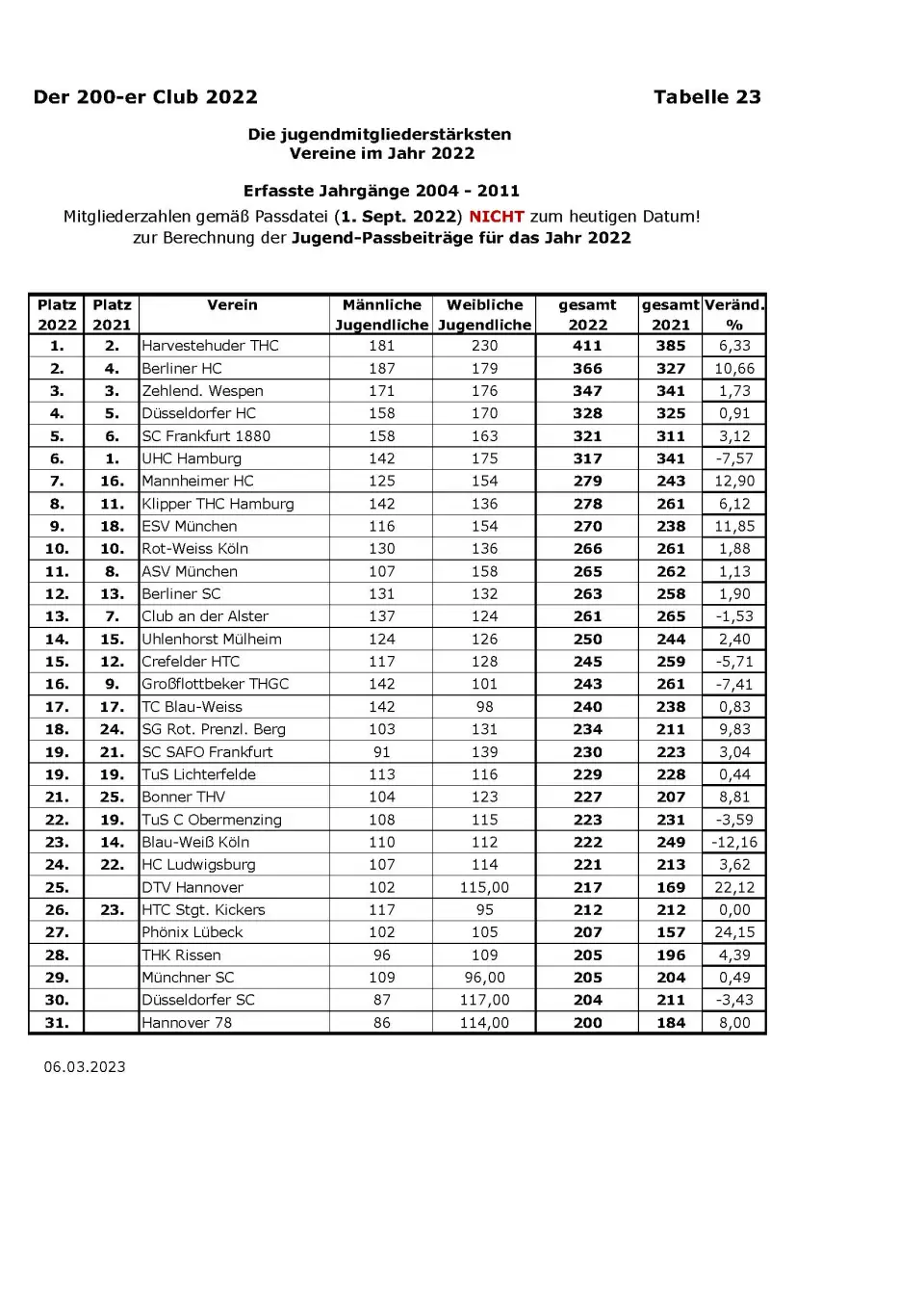 Neu dabei im Club der 200-er sind der DTV Hannover (2021: 169), Phönix Lübeck (2021: 157), THK Rissen (2021: 196) und Hannover 78 (2021: 184).
