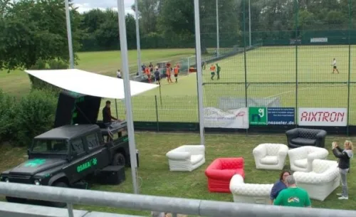 „Das ist ja eine schöne große, sattgrüne Wiese da hinten! Ist das der Zeltplatz oder eine Pferdeweide vom CHIO nebenan?“ – Nein, das ist der Naturrasen! Das hatte die Mehrzahl der Spieler noch nicht gesehen, und schon gar nicht drauf gespielt…also irgendwann, vielleicht mal, vor ewigen Jahren… Viele Spieler versanken also in andächtiger Bewunderung, beziehungsweise im Rätselraten. Wie macht man das? Wie findet man den Ball dort wieder? Und wie bekommt man ihn aus den Löchern wieder heraus? Werde ich hart bestraft, wenn ich ein Stück Rasen raushaue? Fragen über Fragen, aber kurz gesagt: Gesunder Pragmatismus überwog und bei fast allen Teams hieß es – vergesst Schönheit und Technik, haut den Ball nach vorne und tut Euch vor allem nicht weh!