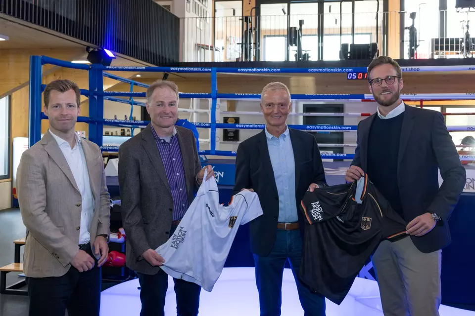 Vertragsunterschrift mit Easy Motion Skin // ©Florian Lechner. Von links nach rechts: Dr. Christoph Menke-Salz, Werner Murr, Jürgen Baltes und Niclas Thiel.