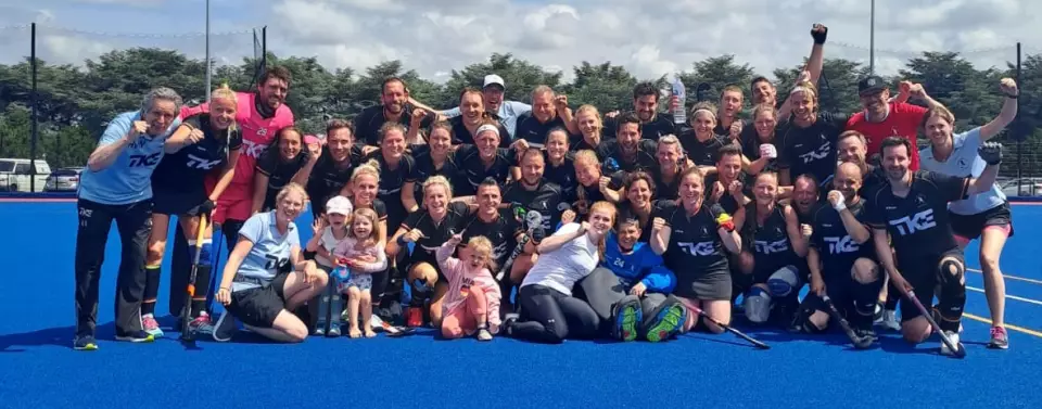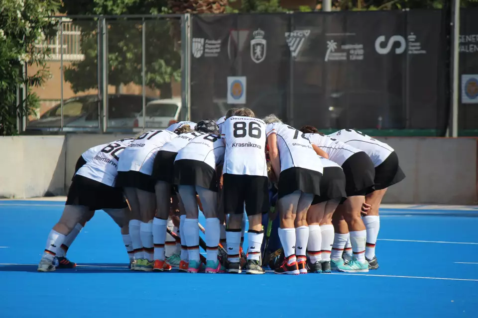 Im zweiten EM-Spiel treffen wir auf die Gastgeberinnen. England gilt auch in der W35-Konkurrenz als Topfavorit. Nach unserer Vorbereitung an Pfingsten wussten wir sehr genau, was auf uns zukommt und welche Aufgaben es zu erfüllen gibt. Bis ins Detail haben wir das in der Spielbesprechung durchgespielt, bis diese durch eine Feueralarm-Übung im Hotel kurzzeitig unterbrochen worden ist. Nichtsdestotrotz machten wir uns danach gut vorbereitet auf den Weg zum Platz, um vor unserem Spiel auch die anderen Masters-Teams vom Spielfeldrand noch zu unterstützen. Um Punkt 16 Uhr starten wir dann topmotiviert in unser heutiges Spiel; von den Seiten und von der Clubhaus-Terrasse gibt es zahlreiche Unterstützung von allen anderen deutschen Masters-Teams - vielen Dank dafür! Von Sekunde 1 an sind wir im Spiel und belohnen uns schnell mit dem 1:0, als wir gut in den Kreis kommen und Elli im Nachsetzen den Ball über die Torlinie bringt. Das ist die erhoffte Führung gegen die amtierenden Weltmeisterinnen, durch die der Druck auf deren Schultern noch größer werden sollte. Sehr diszipliniert halten wir an unseren Spielprinzipien fest, viele Dinge klappen gut. Im Großen und Ganzen lassen wir uns nicht aus der Ruhe bringen und verteidigen einzelne brenzlige Szenen souverän. Dass in der 28. Minute dann eine Strafecke der Engländerinnen in unserem Tor landet, schmälert unsere positive Einstellung nicht. Wir machen einfach weiter und erspielen uns ebenfalls weitere Chancen, es geht hin und her. Als Manu mit dem Schläger einer Engländerin weiterspielt, erhoffen wir uns kurz einen Vorteil durch die entstandene Verwirrung bei den Gegnern, allerdings hält diese nicht lange an! ;-) Erneut eine kurze Ecke bringt uns in der 47. Minute in Rückstand, leider gefolgt vom 1:3 nur fünf Minuten später.