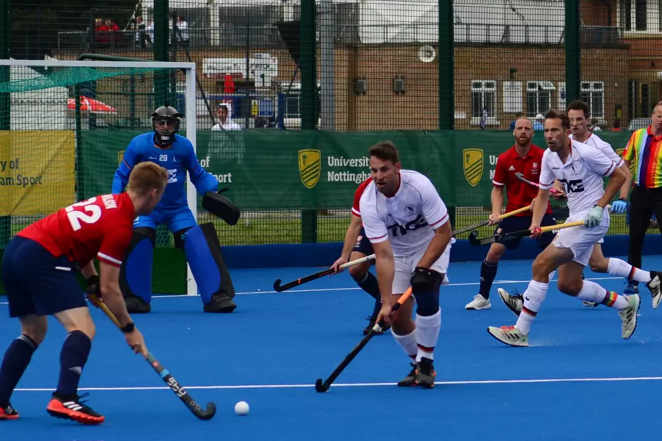 Gerome Wiedelbach, Lennart Clasen und Bastian Lueken belohnen sich bei der EM in Nottingham mit ihren ersten Treffern im letzten Vorrundenspiel gegen Italien, das von englischem Sommerwetter mit starken Böen, Regen und Sonnenschein geprägt war. „Für uns war das Ergebnis zweitrangig. Wir wollten taktisch konzentriert spielen, auf die gemeinsame Linie achten und die Abstimmung untereinander trainieren“, fasst Mannschaftskapitän Martin Klönne nach dem hohen 14:0-Sieg über die Italiener zusammen, die mit nur 12 Spielern antraten. Bereits nach zwei Minuten überwindet Hinrich Nolte nach schönem Zusammenspiel mit Christian Remmers den italienischen Goalkeeper, dessen Abwehr sich per Kurzpässen aus dem Pressing zu lösen sucht. Nachdem Bastian Lueken in der 17.Minute goldrichtig steht und seinen ersten von zwei Masters-Treffern erzielt, färbt der englische Sommerregen den Himmel grau-weiß ein. Gerome Wiedelbach und Lennart Clasen folgen dem Beispiel und tragen sich erfolgreich in die Torschützenliste ein. Im Verlauf erhöht die M50 den Druck und kommt so zu weiteren Strafecken und Torchancen, die zum Halbzeitstand von 8:0 führen. Gelungene Spielverlagerungen im Mittelfeld über den überall zu findenden Steffen Bunzel tragen dazu bei, dass die vorgerückten Außenverteidiger Gunther Deinl und Andreas Hatz lange Bälle ins italienische Viertel spielen können, die von Lars Brenneke und Stefan Braner zu gefährlichen Kreisszenen verarbeitet werden. Immer wieder prüfen die deutschen Stürmer den italienischen Goalkeeper, der sich wacker schlägt, aber den Endstand von 14:0 nicht verhindern kann. Im Viertelfinale wartet mit Schottland eine fordernde Aufgabe auf die M50.