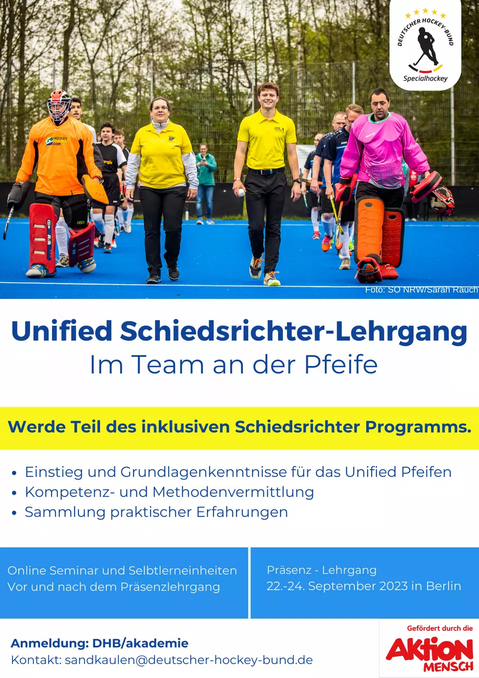 Dann ist das Unified Schiedsrichter Programm genau das richtige für dich. Wir machen dich fit für dein Engagement mit der Pfeife im Bereich Specialhockey. In der inklusiven Ausbildung lernen Menschen mit und ohne geistige Behinderung von – und miteinander als Schiedsrichter auf dem Platz zu stehen.