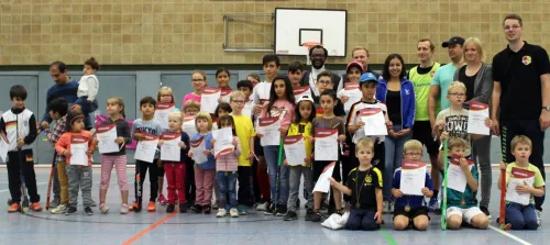 Zu Beginn standen aber klar die Kleinen im Mittelpunkt. Angeleitet von Katja Altenau, Yamna Sahli, Christian Karrasch, Bernd Temme und Christian Klaes absolvierten die Mädchen und Jungen mit großer Begeisterung das Hockeyabzeichen für Kinder des DHB. Dazu mussten sie den Ball auf den Schläger jonglieren, dribbeln, passen und schießen. Erst gab es Punkte für jede erledigte Aufgabe, zur Belohnung dann Medaillen, Urkunden und Armbänder mit der Aufschrift "Hockeyheld". Toni Tuklan und Philipp Gärtner (Volksbank Kamen-Werne) nahmen die Siegerehrung vor.