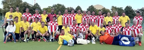 Und so war die Basis für einen sehr schönen Senioren-Hockey-Tag in München gelegt. Das 115. Spiel in diesem Pokalwettbewerb war dann - aufgrund des Verlaufes im ersten Viertel – schnell eine vergleichsweise eindeutige Angelegenheit. Herausforderer Bremer begann stürmisch und druckvoll – und erspielte sich in den ersten Minuten auch gleich zwei Kreissituationen. Erhielten dann aber einen schnellen Dämpfer, als die Münchner nach sieben Minuten ihren ersten Angriff durch Stephan Köhler zum 1:0 nutzen. Und bevor die Bremer sich neu sortiert hatten, nutzten Florian Zollner und Bastian Riedel (ein gebürtiger Bremer; es sei ihm hoffentlich verziehen aus Bremen) in den Folgeminuten die nächsten beiden Chancen zum 2:0 und 3:0. Somit war das Spiel eigentlich im ersten Viertel entschieden; denn vier Tore aufzuholen (der Herausforderer muss ja gewinnen) schien zu diesem Zeitpunkt nicht mehr sonderlich realistisch. So dass beide Mannschaften (neben der ein oder anderen „freundlichen“ Konversation auf dem Platz – ganz ohne geht es beim Seniorenhockey dann natürlich auch nicht!) das restliche Spiel vor ziemlich großer Zuschauerkulisse für ein Seniorenspiel friedlich und freundschaftlich zu Ende spielten – mit gelegentlichen weiteren Toren der Münchner bis zum finalen Ergebnis von 7:0. Mit der Verabschiedung und dem gemeinsamen Mannschaftsfoto war das Ergebnis dann aber auch schon vergessen. Die Bilder zu diesem Artikel zeigen es – es war ein herrlicher Sonnentag in München. Und der „Mut“, das Spiel stattfinden zu lassen, wurde durch das Wetter bereits während des Spiels „belohnt“, aber ganz besonders auch in der dritten Halbzeit.