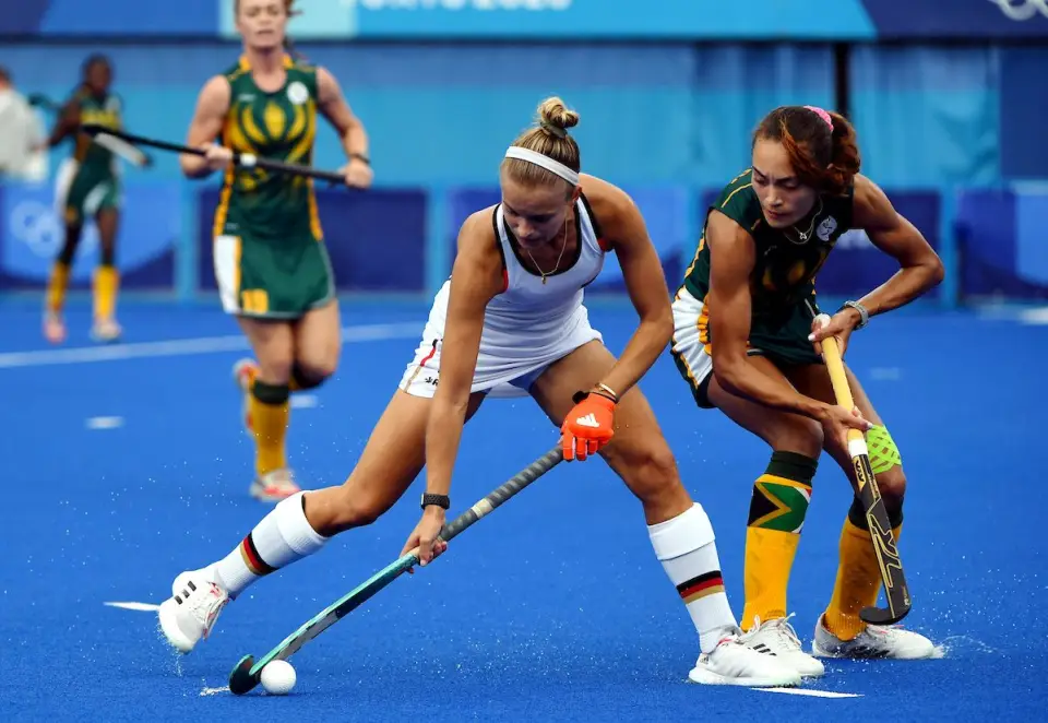 Sonntag parierte die Variante auf die Rausgeberin mit dem Schläger stark. Und kurz darauf war die deutsche Keeperin auch gegen einen Stecher von Tarryn Glasby mit toller Reaktion zur Stelle (37.). Charlotte Stapenhorst holte dann die nächste Ecke heraus, bei der Mbande schon geschlagen war, aber Celia Seerane auf der Linie gegen den Schuss von Zimmermann und den Nachschuss rettete.